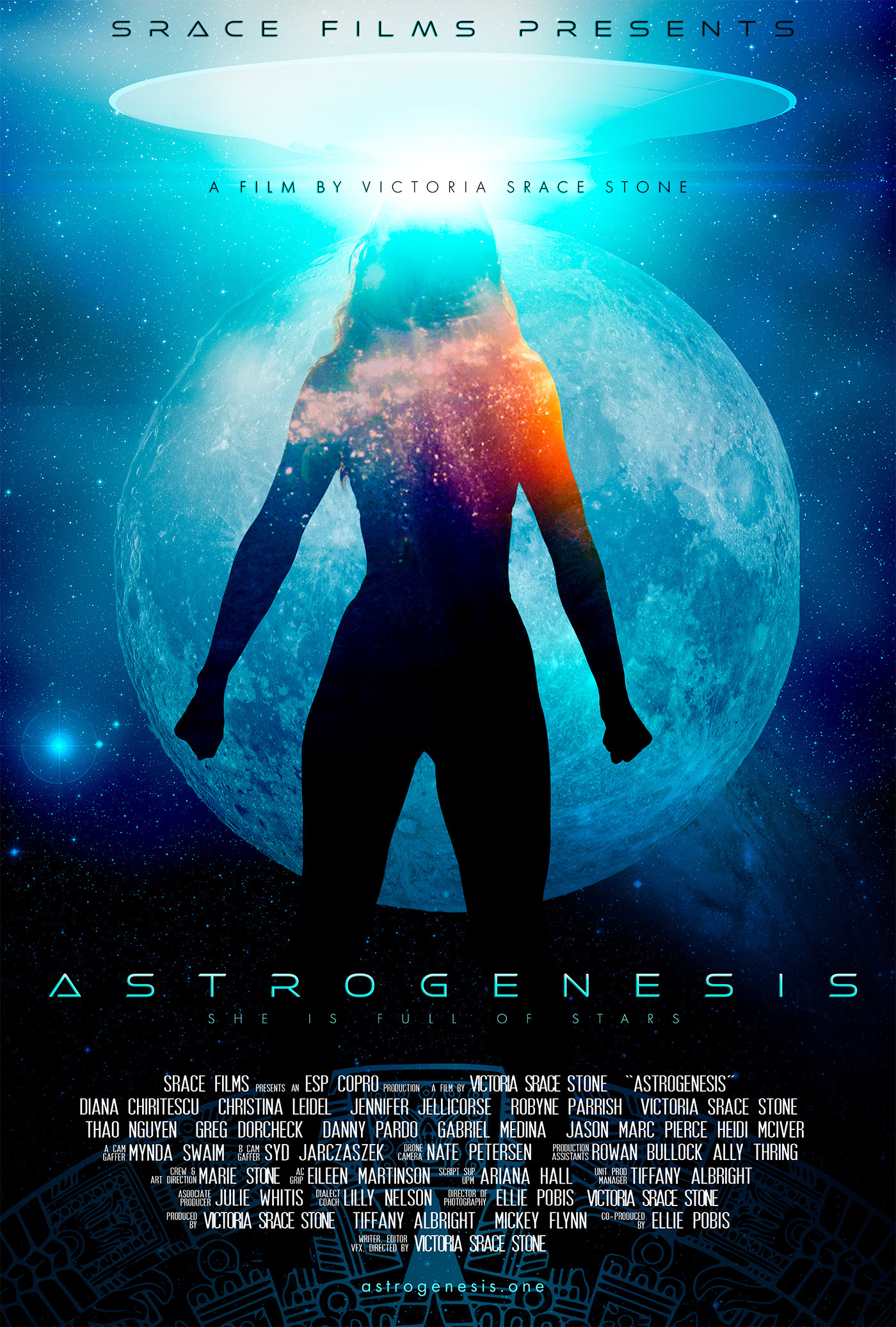 Astrogenesis (originally Nemesis Eterna) is a SAG Micro-budget (sub $20K) feature film from Srace Films, ESP CoPro & Lunar Kitchen Films originally began during the pandemic in North Carolina, USA but halted when director/writer/actor Victoria Srace Stone was disabled with Complex Regional Pain Syndrome.